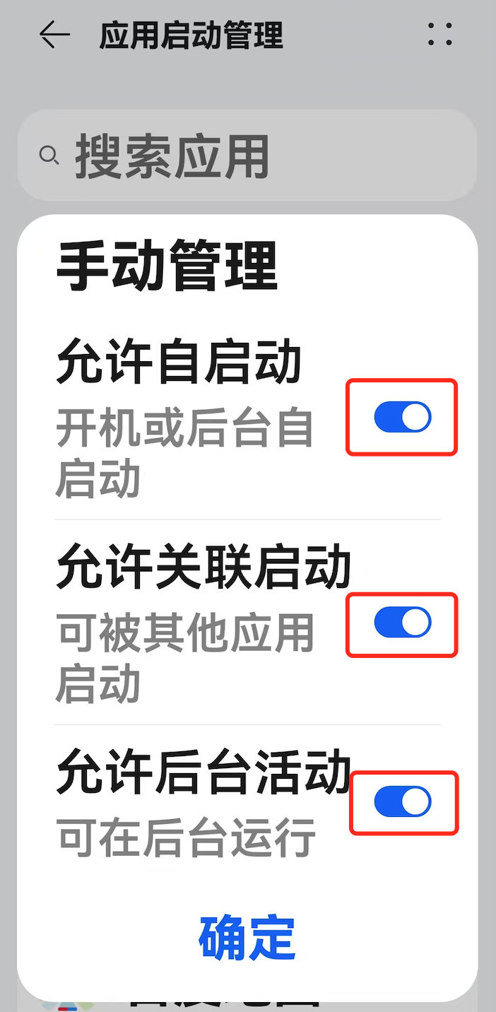 关闭自动管理后,在弹出框中打开允许自启动、关联启动和后台活动